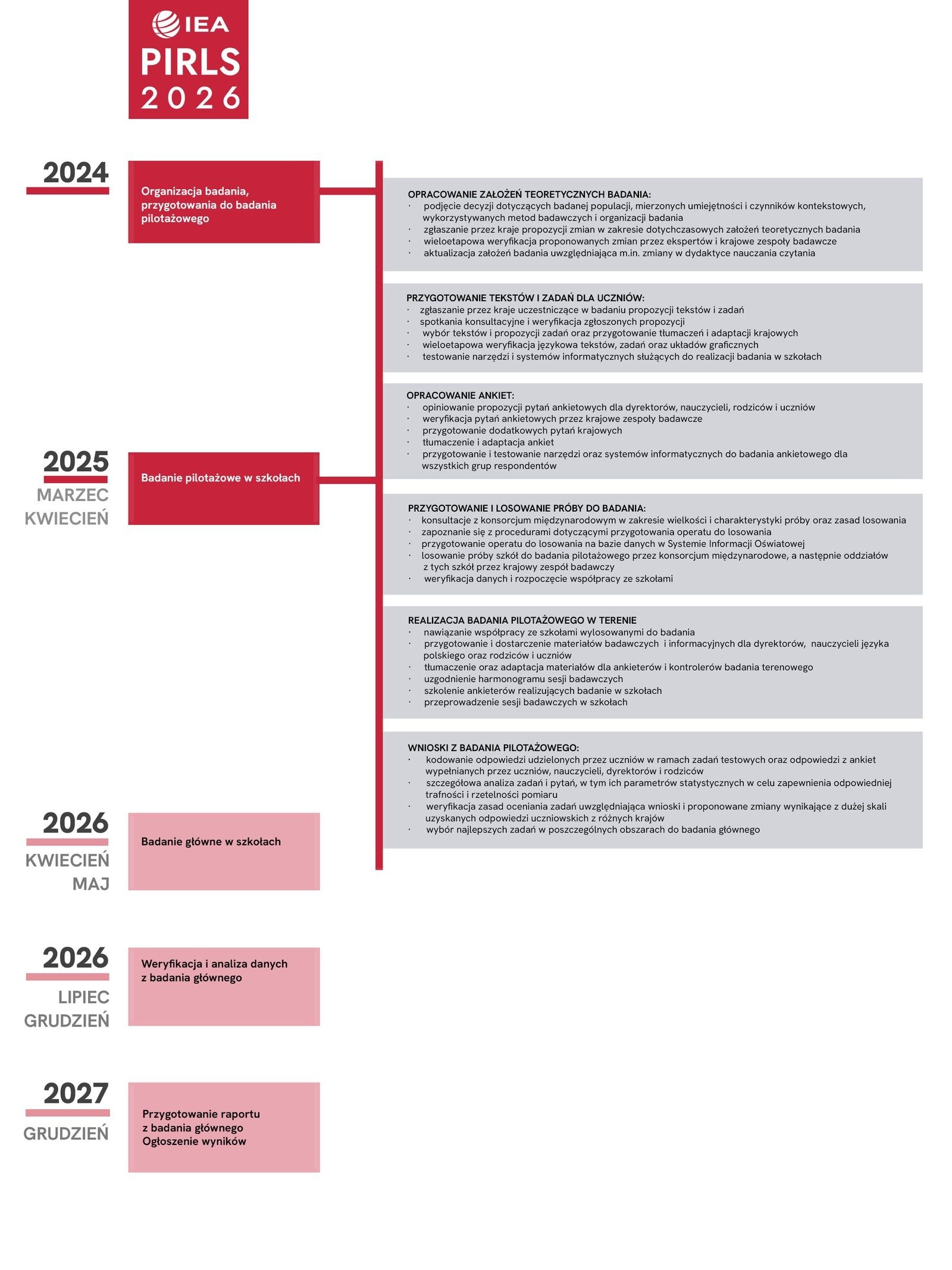 Przygotowania do trwającej edycji badania PIRLS 2026 rozpoczęły się w 2023 roku, zaś całe przedsięwzięcie zakończy się ogłoszeniem wyników pod koniec 2027 roku. Poniżej przedstawiamy  najważniejsze etapy badania oraz działania, które do tej pory przeprowadził  krajowy zespół badawczy Instytutu Badań Edukacyjnych – Państwowego Instytut Badawczego. Każdy z etapów badania prowadzony jest we współpracy z międzynarodowym konsorcjum.