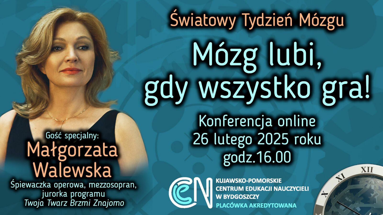 Kujawsko-Pomorskie Centrum Edukacji Nauczycieli w Bydgoszczy w ramach przygotowań do Światowego Tygodnia Mózgu zaprasza nauczycieli wszystkich specjalności na konferencję online "Mózg lubi, gdy wszystko gra!".