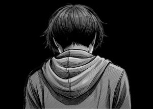 • Nastolatek w bluzie z kapturem z pochyloną głową (widok z tyłu).