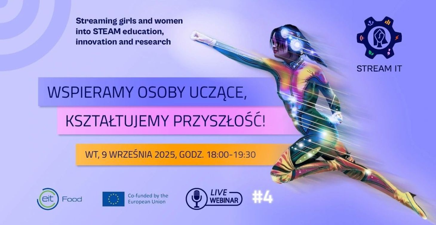 Organizacja EIT Food CLC North-Eas zaprasza na 4. webinar z serii „STREAM IT – Wspieramy osoby uczące, kształtujemy przyszłość” w ramach projektu STREAM IT, którego celem jest zainicjowanie zmian w zakresie utrzymujących się nierówności płci w edukacji, badaniach i innowacjach w dziedzinie nauk ścisłych STEAM (nauka, technologia, inżynieria, sztuka i matematyka).