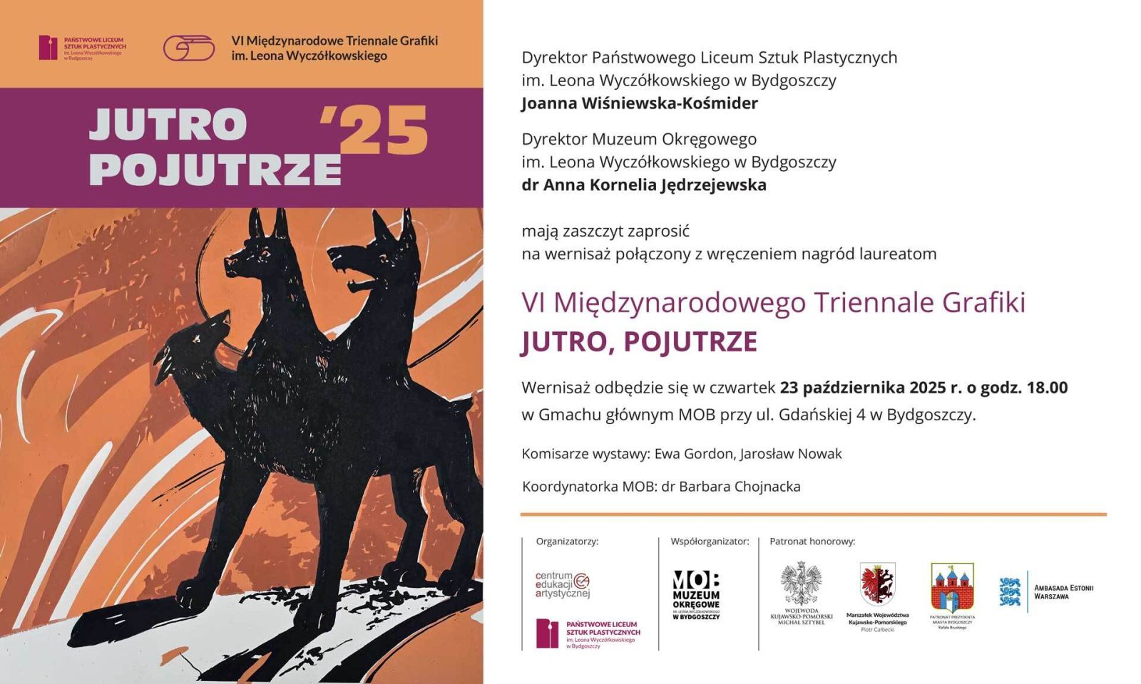 Dyrektor Państwowego Liceum Sztuk Plastycznych im. Leona Wyczółkowskiego w Bydgoszczy Joanna Wiśniewska-Kośmider oraz dyrektor Muzeum Okręgowego im. Leona Wyczółkowskiego w Bydgoszczy dr Anna Kornelia Jędrzejewska mają zaszczyt zaprosić na otwarcie wystawy połączone z wręczeniem nagród laureatom VI Międzynarodowego Triennale Grafiki JUTRO, POJUTRZE.