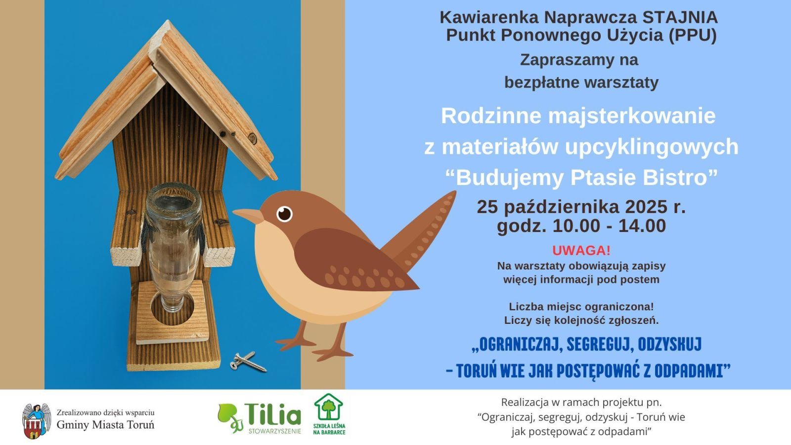 Stowarzyszenie Tilia oraz Szkoła Leśna na Barbarce zapraszają na FAMILIJNE WARSZTATY w Kawiarence Naprawczej STAJNIA. Już 25 października 2025 r. odbędą się kolejne warsztaty - dla rodziców z dziećmi powyżej 7 roku życia. Podczas warsztatów z serii "Rodzinne majsterkowanie", wykonacie własnoręcznie PTASIE BISTRO czyli inny niż wszystkie karmnik dla ptaków – praktyczny, piękny i ekologiczny. Karmnik wykonamy z upcyclingowych materiałów – resztek stolarskich, które dostaną drugie życie w Waszych rękach.
