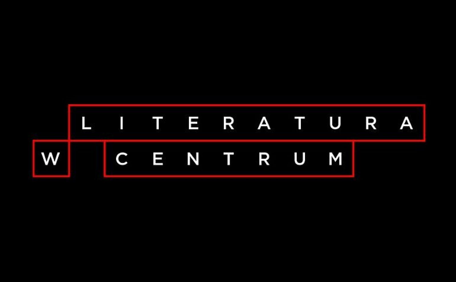 • Na czarnym tle napis w czerwonej ramce białą czcionką: Literatura w Centrum.