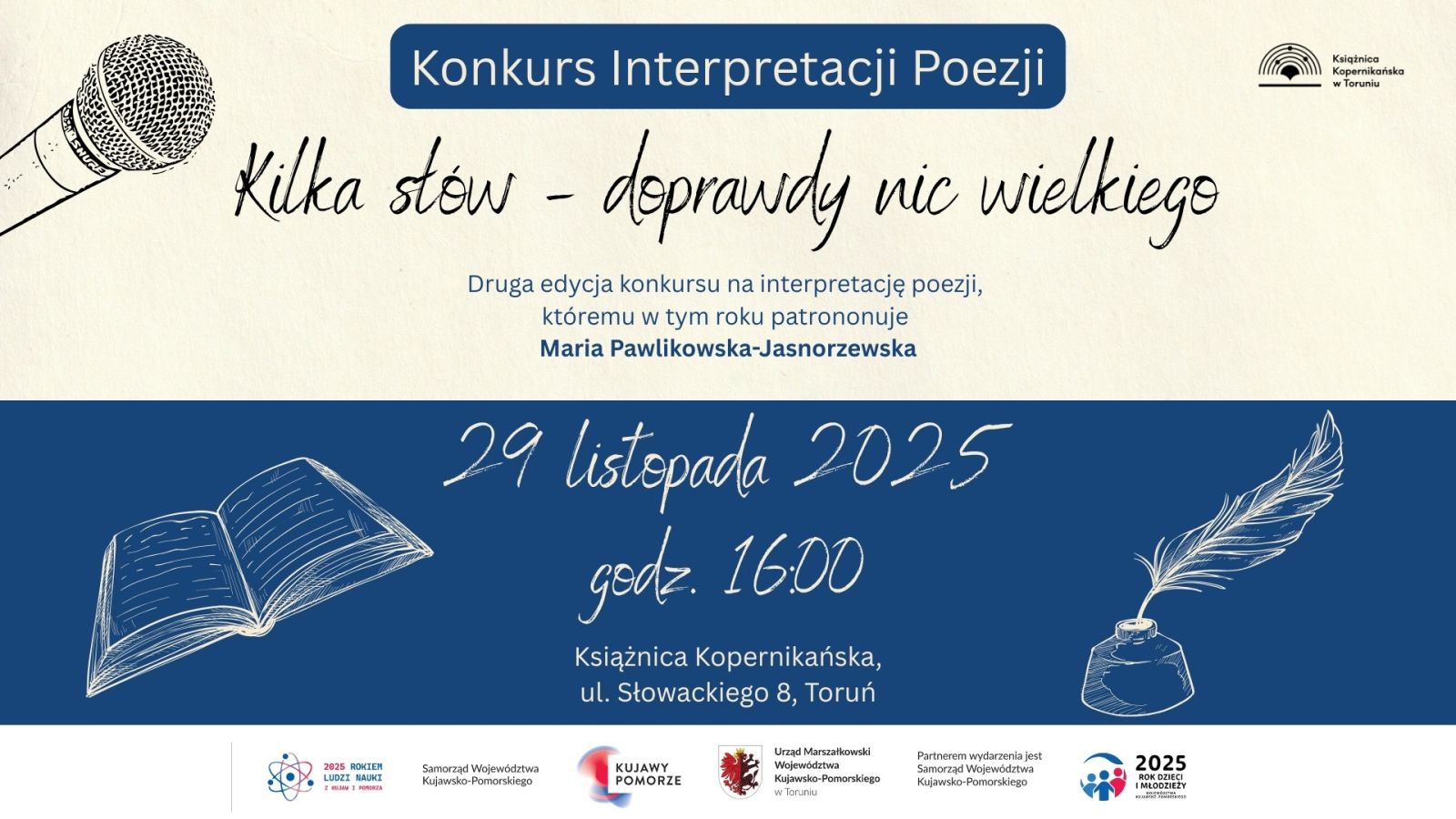 29 listopada Książnica Kopernikańska w Toruniu zaprasza do udziału w 2. edycji konkursu na interpretację poezji. W tym roku konkursowi patronuje Maria Pawlikowska-Jasnorzewska.