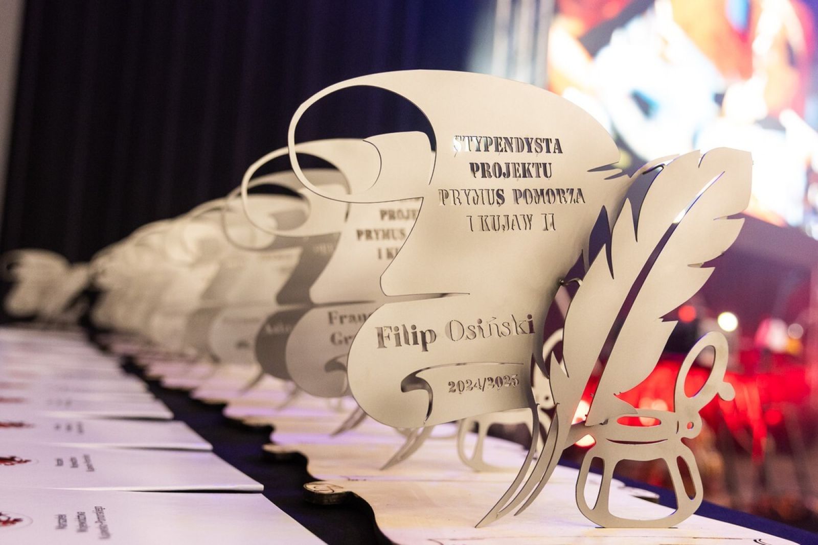 • Statuetki projektu dla stypendystów w kształcie pióra z kałamarzem oraz żagla.