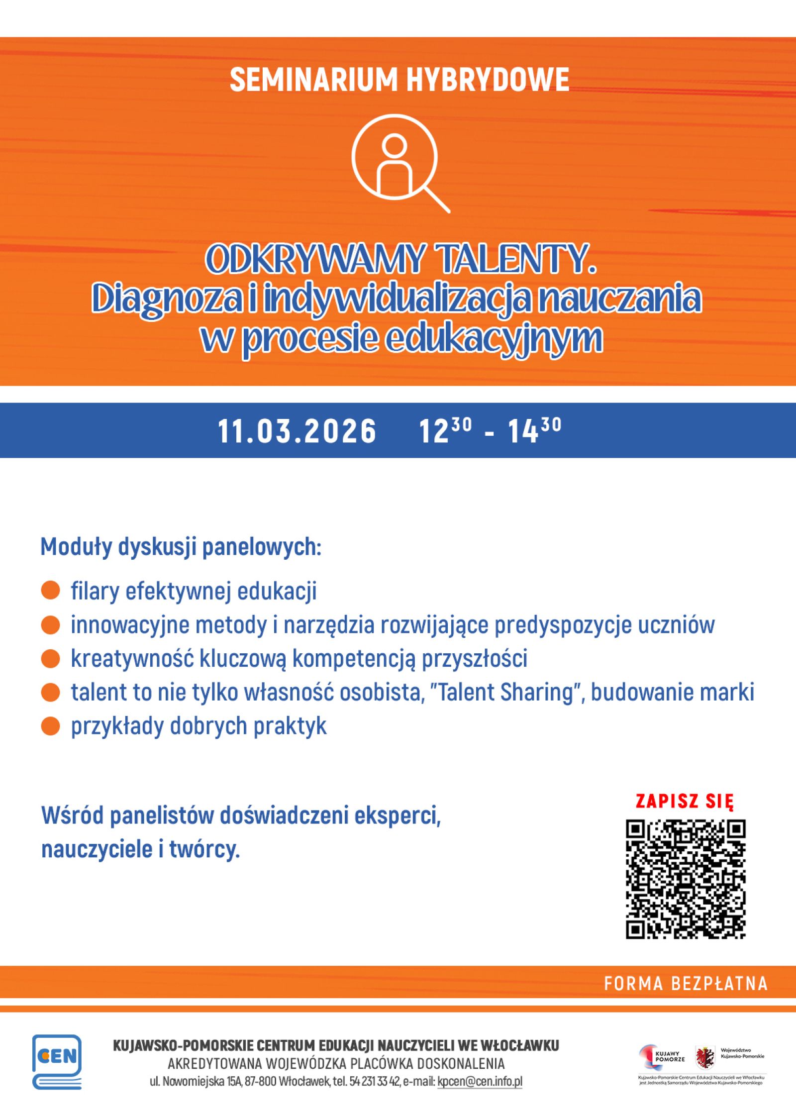 Kujawsko-Pomorskie Centrum Edukacji Nauczycieli we Włocławku zaprasza nauczycieli, wychowawców, animatorów, instruktorów wszystkich typów szkół, przedszkoli czy instytucji kultury do udziału w bezpłatnym seminarium hybrydowym "Odkrywamy talenty. Diagnoza i indywidualizacja nauczania w procesie edukacyjnym", które odbędzie się 11 marca 2026 r. o godz. 12.30.