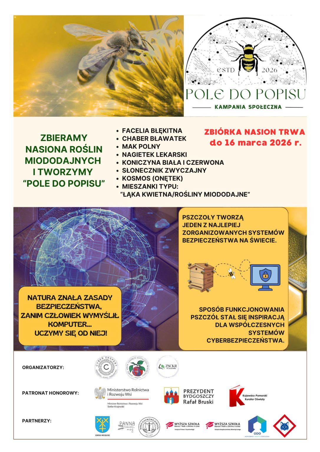 • Plakat informacyjny kampanii społecznej „Pole do popisu” z motywem pszczół i logotypami organizatorów.