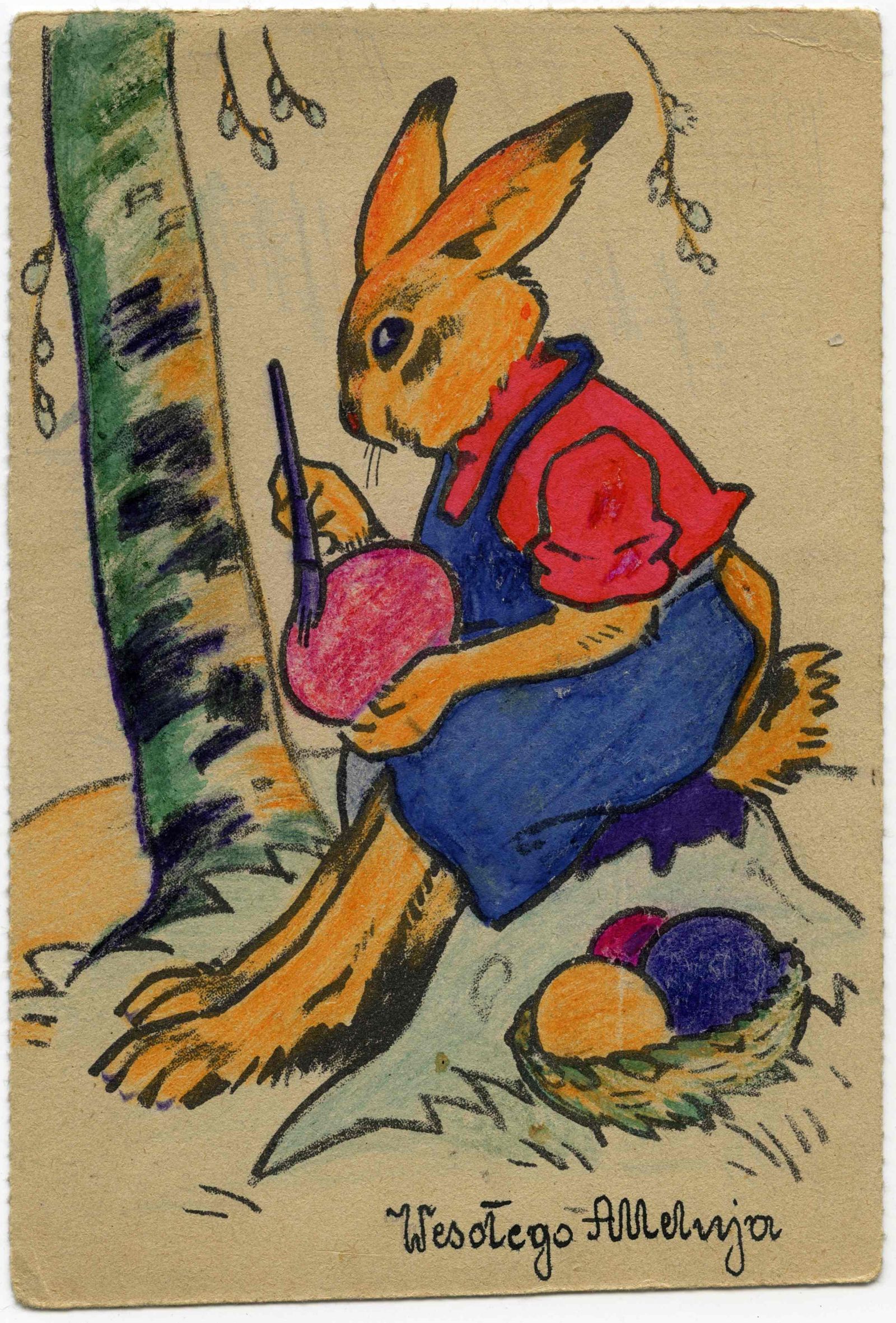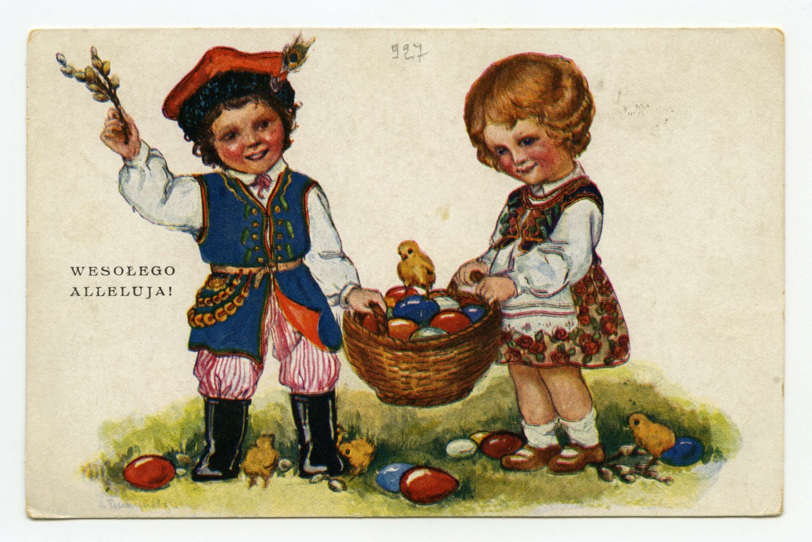 • Pocztówka z namalowanymi dziećmi: dziewczynką i chłopcem, trzymające koszyk z kolorowymi jajkami.
