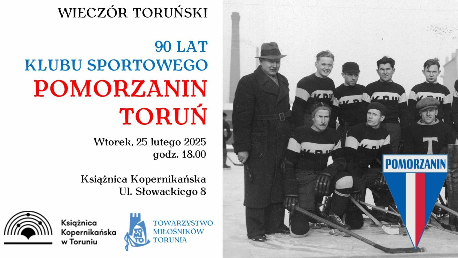W tym roku mija 90 lat od powstania "Pomorzanina" - najstarszego i najbardziej zasłużonego klubu sportowego w Toruniu. Z tej okazji 25 lutego Książnica Kopernikańska zaprasza na kolejny Wieczór Toruński, który w całości poświęcimy historii i osiągnięciom "Pomorka".