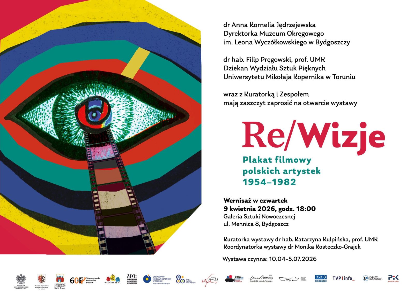 Dr Anna Kornelia Jędrzejewska, dyrektorka Muzeum Okręgowego im. Leona Wyczółkowskiego w Bydgoszczy oraz dr hab. Filip Pręgowski, prof. UMK, dziekan Wydziału Sztuk Pięknych Uniwersytetu Mikołaja Kopernika w Toruniu wraz z Kuratorką i Zespołem mają zaszczyt zaprosić na otwarcie wystawy "Re/Wizje. Plakat filmowy polskich artystek 1954-1982".