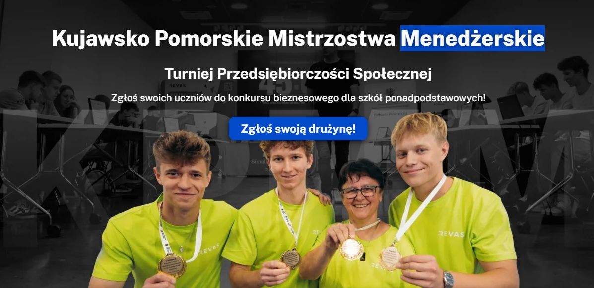 Kujawsko-Pomorskie Mistrzostwa Menedżerskie Turniej Przedsiębiorczości Społecznej (KPMM) to praktyczny konkurs biznesowy skierowany do uczniów i nauczycieli szkół ponadpodstawowych z całego województwa kujawsko-pomorskiego. Trzyosobowe zespoły uczniowskie zarządzają wirtualnymi firmami w formie przedsiębiorstwa społecznego, używając Branżowych Symulacji Biznesowych REVAS. Udział w konkursie jest bezpłatny.