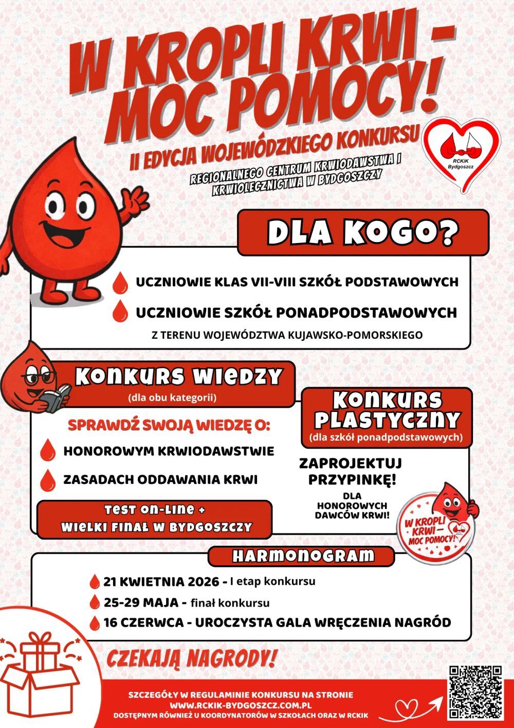 Regionalne Centrum Krwiodawstwa i Krwiolecznictwa w Bydgoszczy zaprasza uczniów szkół z województwa kujawsko-pomorskiego do udziału w II edycji konkursu „W kropli krwi — moc pomocy!”.