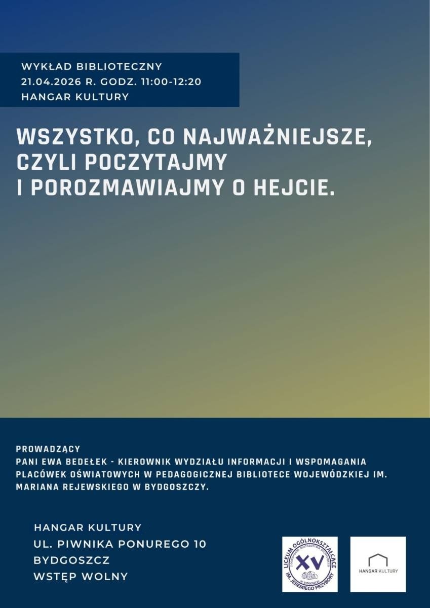 • Plakat informacyjny wykładu „Wszystko, co najważniejsze, czyli poczytajmy i porozmawiajmy o hejcie”.