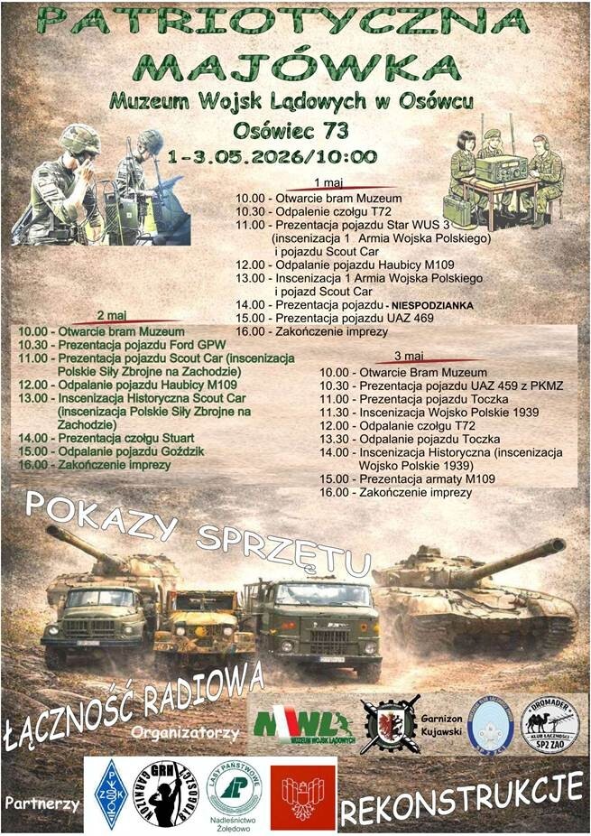 Dyrektor Muzeum Wojsk Lądowych w Bydgoszczy zaprasza na wyjątkowe wydarzenie patriotyczne, w ramach obchodów świąt 1-3 maja br., których oficjalna część odbędzie się 2 maja 2026 roku w oddziale Muzeum w Osówcu w godzinach 10.00 – 13.00.