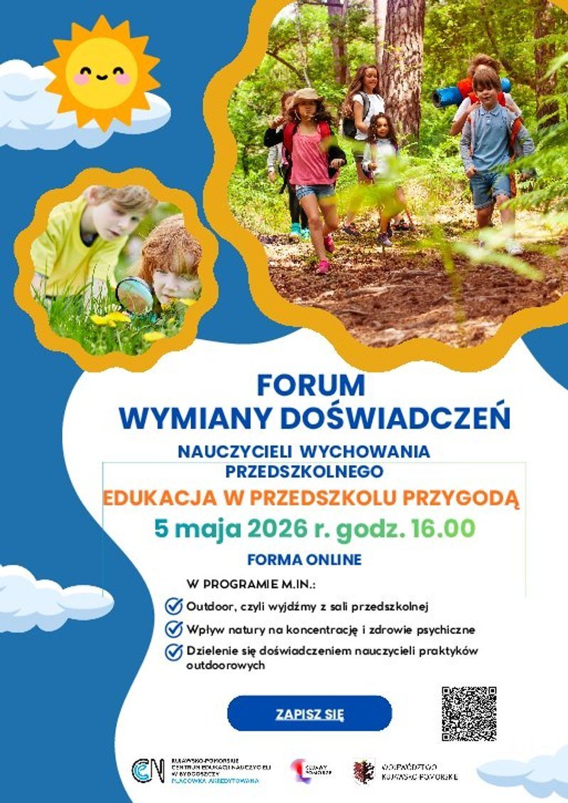 Bezpłatne forum wymiany doświadczeń nauczycieli wychowania przedszkolnego pt. "Edukacja w przedszkolu przygodą" odbędzie się 5 maja 2026 roku w godzinach 16.00-18.00 na platformie ClickMeeting. Forum organizuje Kujawsko-Pomorskie Centrum Edukacji Nauczycieli w Bydgoszczy.