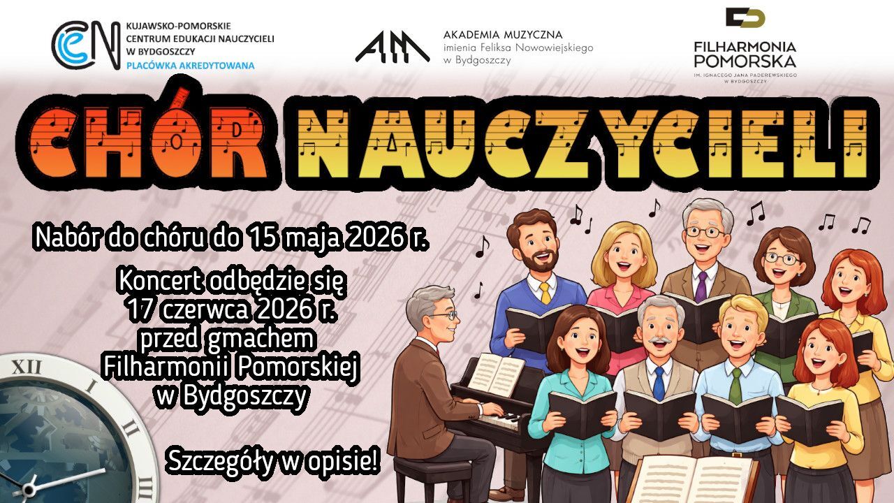 Kujawsko-Pomorskie Centrum Edukacji Nauczycieli w Bydgoszczy wraz z Akademią Muzyczną w Bydgoszczy zapraszają do udziału w projekcie koncertowym „Chór nauczycieli”. Chór jest ukierunkowana na nauczycieli pracujących we wszystkich typach placówek – publicznych, niepublicznych, muzycznych, ogólnokształcących, prywatnych. Celem przedsięwzięcia jest konsolidacja środowiska nauczycielskiego, promowanie kultury, doskonalenie muzycznego warsztatu pracy oraz wymiana doświadczeń. Projekt zakończy się koncertem w ramach cyklu „Muzyczne leżakowanie w Wiolinowie” 17.06.2026 r. ok. godz.17.30 na Placu Krzysztofa Pendereckiego przed gmachem Filharmonii Pomorskiej w Bydgoszczy.