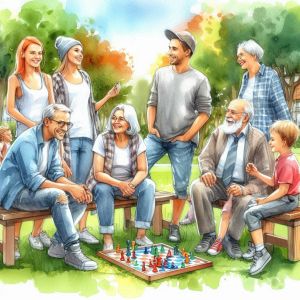 • Uśmiechnięte osoby w różnym wieku podczas wspólnej zabawy w parku.