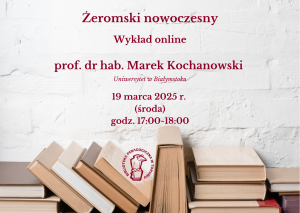 Biblioteka Pedagogiczna im. gen. bryg. prof. Elżbiety Zawackiej w Toruniu serdecznie zaprasza do udziału w wykładzie online "Żeromski nowoczesny". Wydarzenie odbędzie się na platformie Microsoft Teams 19 marca 2025 r. (środa) w godz. 17:00-18:00. Wykład wygłosi prof. dr hab. Marek Kochanowski z Uniwersytetu w Białymstoku.
