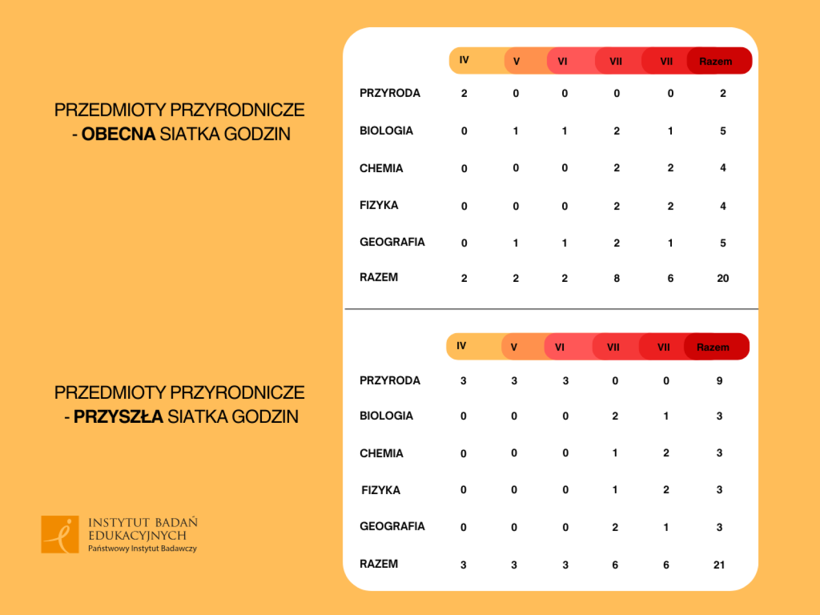 3 godziny przyrody tygodniowo w każdym roku w klasach IV-VI, łącznie po 3 godziny tygodniowo biologii, chemii, fizyki i geografii w klasach VII-VIII. To razem 21 godzin przedmiotów przyrodniczych w klasach IV-VIII. Przy założeniu, że zagadnienia z fizyki i chemii pojawią się na wcześniejszym etapie edukacji, w ramach właśnie przyrody.