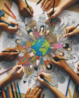 • Widok na dłonie dzieci rysujących wspólnie obrazek.