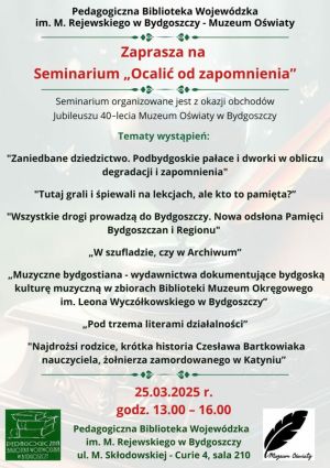 Pedagogiczna Biblioteka Wojewódzka im. M. Rejewskiego w Bydgoszczy – Muzeum Oświaty zaprasza na seminarium „Ocalić od zapomnienia” dla bibliotekarzy, nauczycieli historii, przedstawicieli organizacji kulturalnych i muzealników.