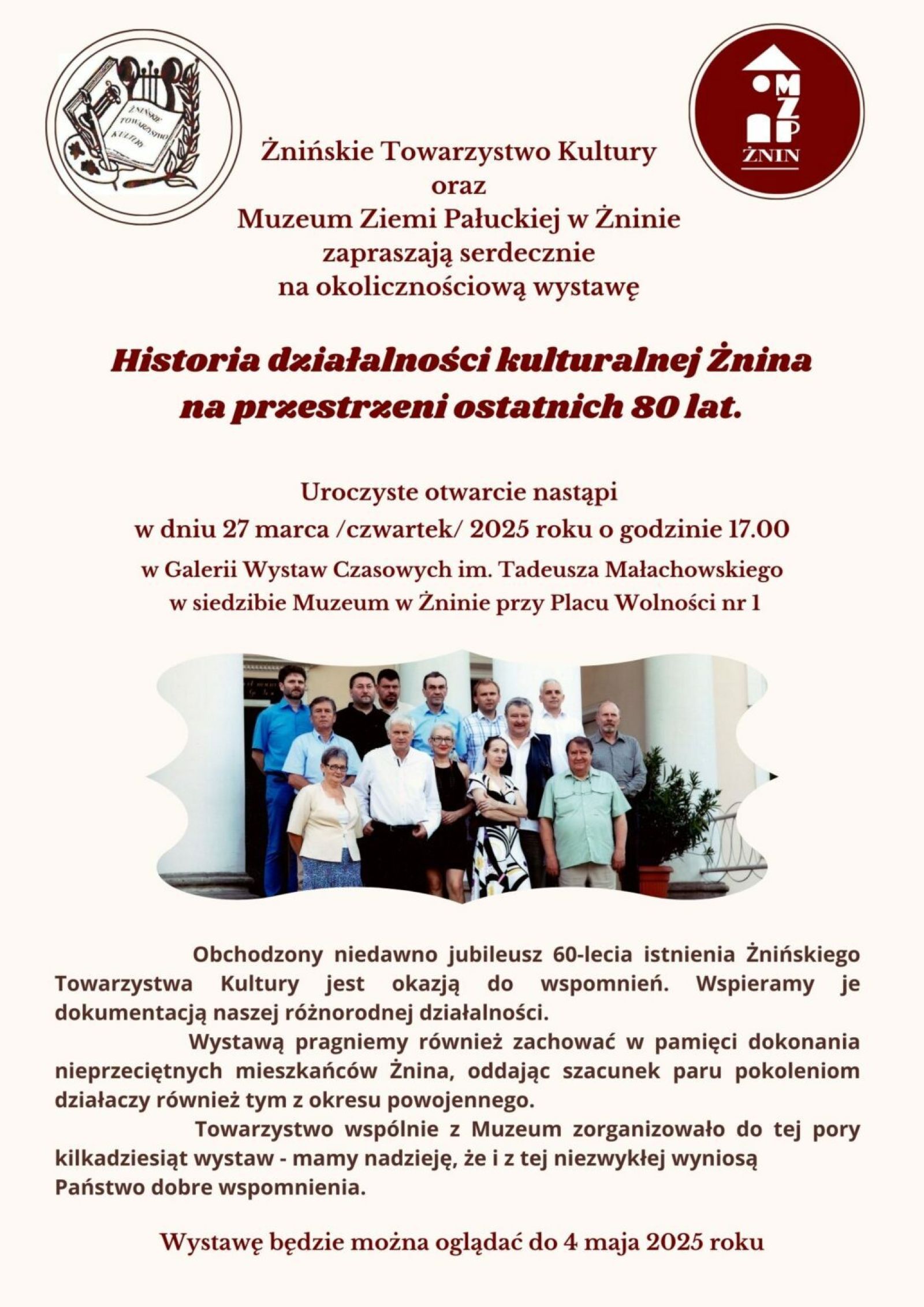 Żnińskie Towarzystwo Kultury oraz Muzeum Ziemi Pałuckiej w Żninie serdecznie zapraszają na wystawę "Historia działalności kulturalnej Żnina na przestrzeni ostatnich 80 lat". Uroczyste otwarcie nastąpi 27 marca (czwartek) b.r. o godz. 17.00 w Galerii Wystaw Czasowych im. Tadeusza Małachowskiego w siedzibie Muzeum w Żninie przy Placu Wolności 1.