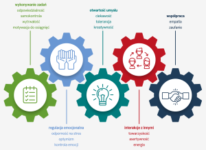 • Kompetencje społeczne i emocjonalne przedstawione jako koła o zębatych brzegach.