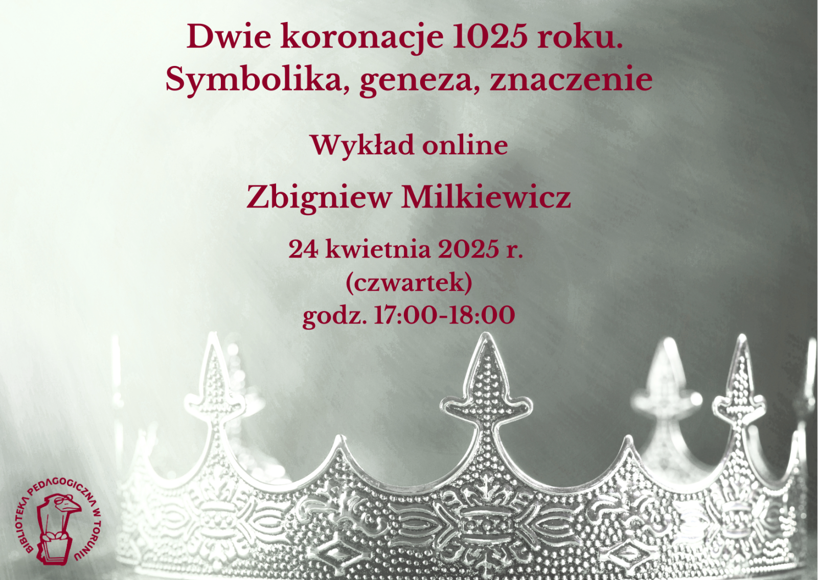 Biblioteka Pedagogiczna im. gen. bryg. prof. Elżbiety Zawackiej w Toruniu serdecznie zaprasza do udziału w wykładzie online "Dwie koronacje 1025 roku. Symbolika, geneza, znaczenie". Wydarzenie odbędzie się na platformie Microsoft Teams 24 kwietnia 2025 r. (czwartek) w godz. 17:00-18:00. Wykład wygłosi Zbigniew Milkiewicz, nauczyciel z X Liceum Ogólnokształcącego im. prof. Stefana Banacha w Toruniu.