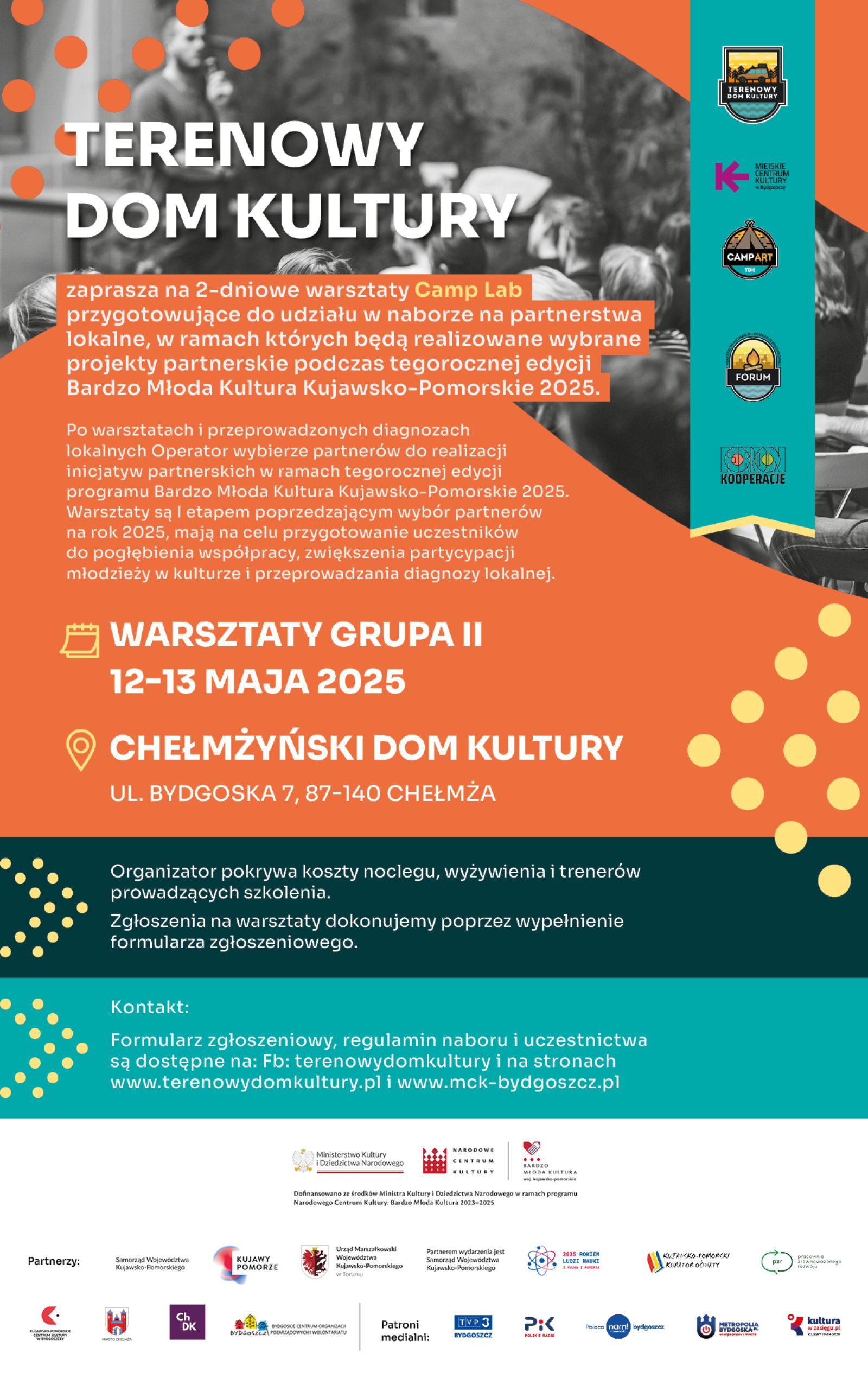 Terenowy Dom Kultury zaprasza na 2-dniowe warsztaty Camp-Lab przygotowujące do udziału w naborze na partnerstwa lokalne, w ramach których będą realizowane wybrane projekty partnerskie podczas tegorocznej edycji Bardzo Młoda Kultura Kujawsko-Pomorskie 2025.