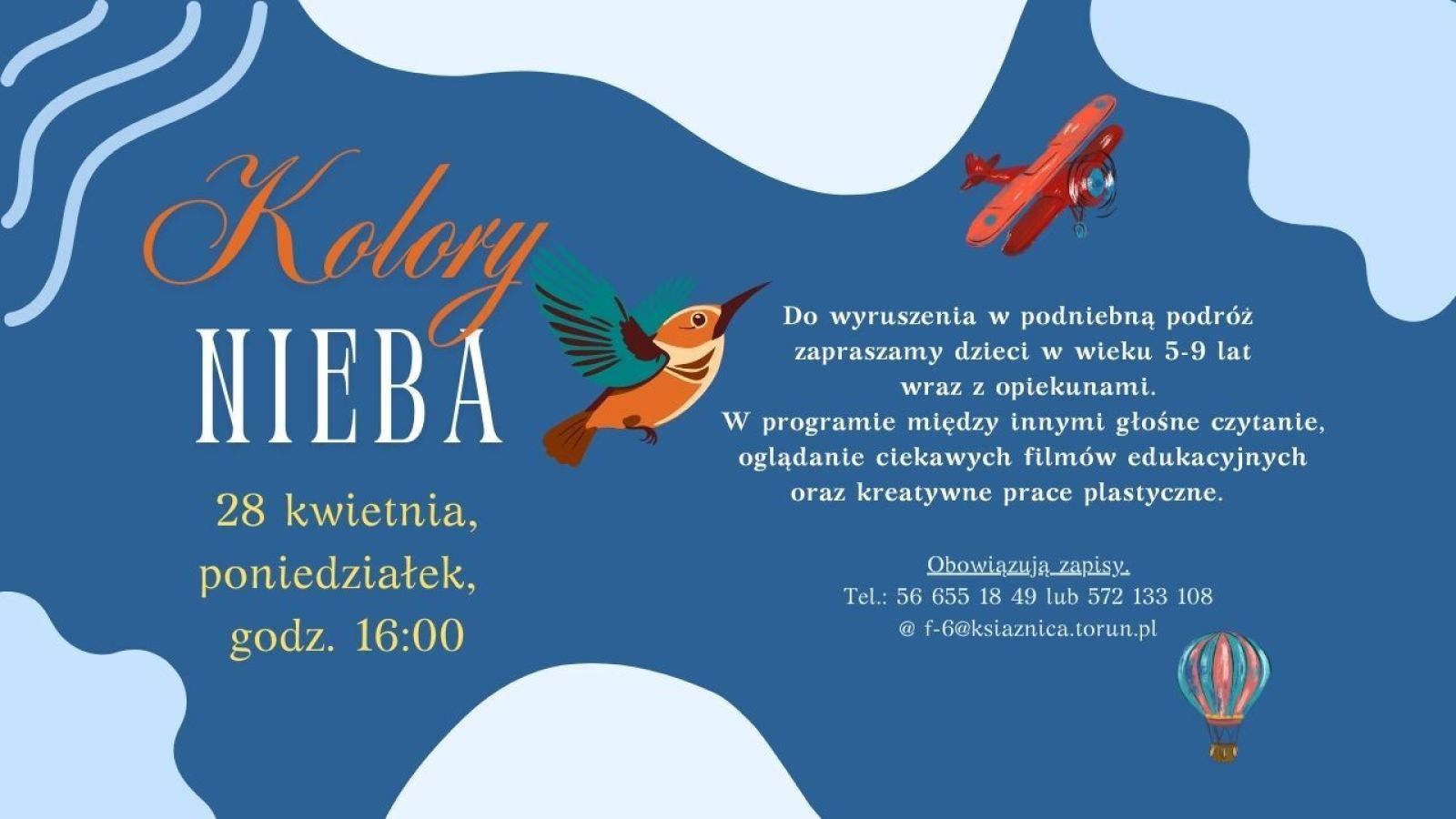 W kwietniu obchodzimy Dzień Patrzenia w Niebo. Z tej okazji Biblioteka Lelewela (ul. Lelewela 3 w Toruniu) zaprasza dzieci w wieku od 5 do 9 lat (wraz z opiekunami) do udziału w zajęciach literacko-plastycznych, podczas których uczestnicy sprawdzą, czy niebo jest rzeczywiście błękitne.