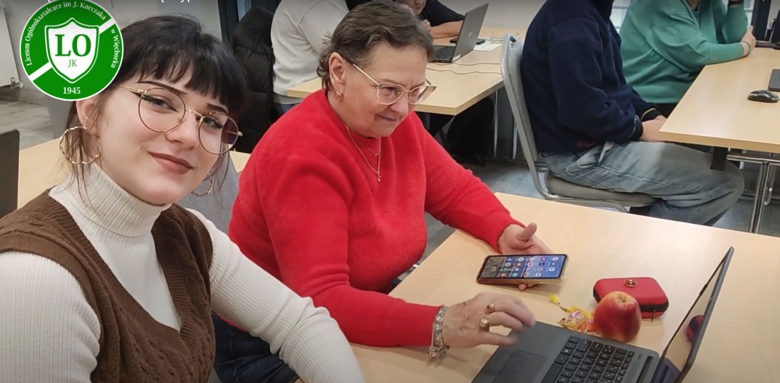 • Seniorka i uczennica siedzą ze smartfonem przy laptopie.