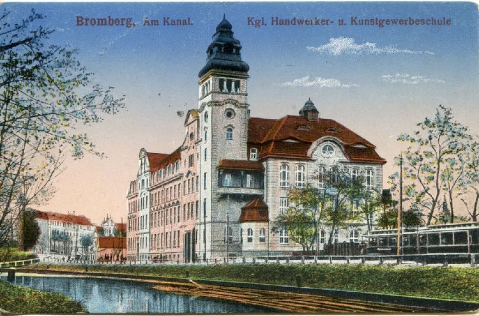 Gmach przy ówczesnej ulicy Berlińskiej (obecnie Św. Trójcy) stanął ostatecznie w 1911 r. w pięknie położonym miejscu tuż nad Kanałem Bydgoskim. Ostatecznie jesienią działalność zainaugurowała Królewsko-Pruska Szkoła Rzemiosł i Przemysłu Artystycznego, której pierwszym dyrektorem został ceniony architekt Arno Koernig.