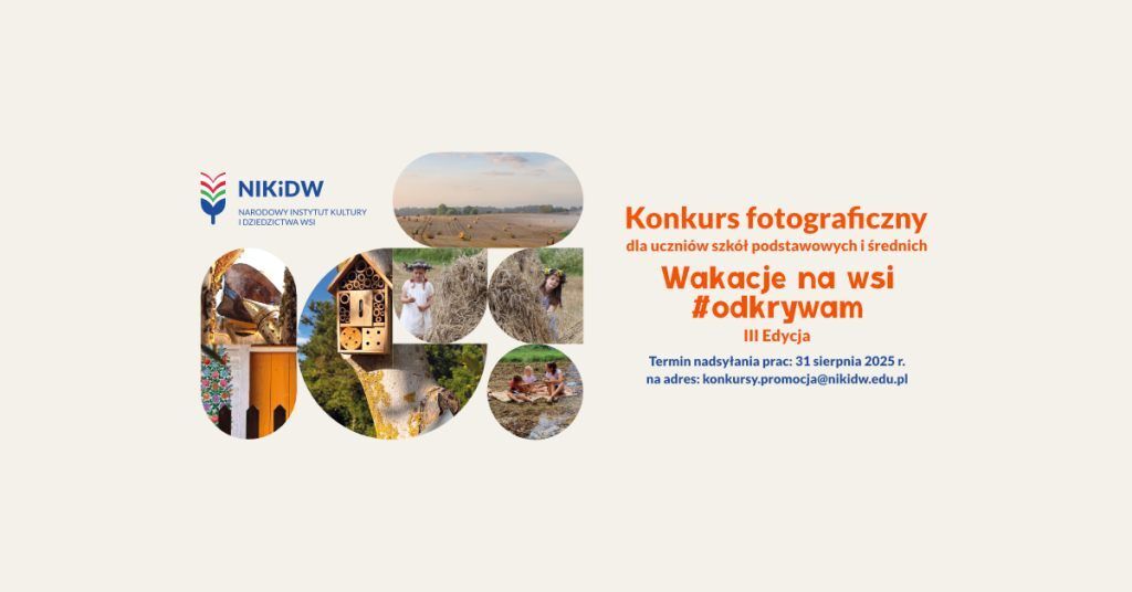 • Kolaż zdjęć o tematyce wiejskiej i logo NIKiDW na plakacie konkursu fotograficznego.