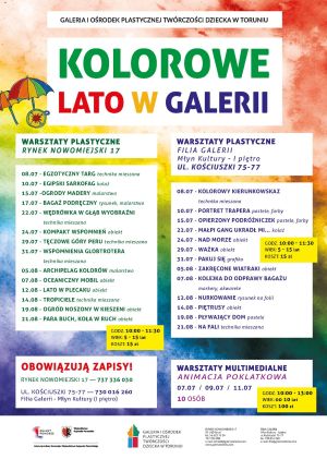 • Plakat promujący zajęcia Kolorowe lato w galerii ze szczegółowym programem.