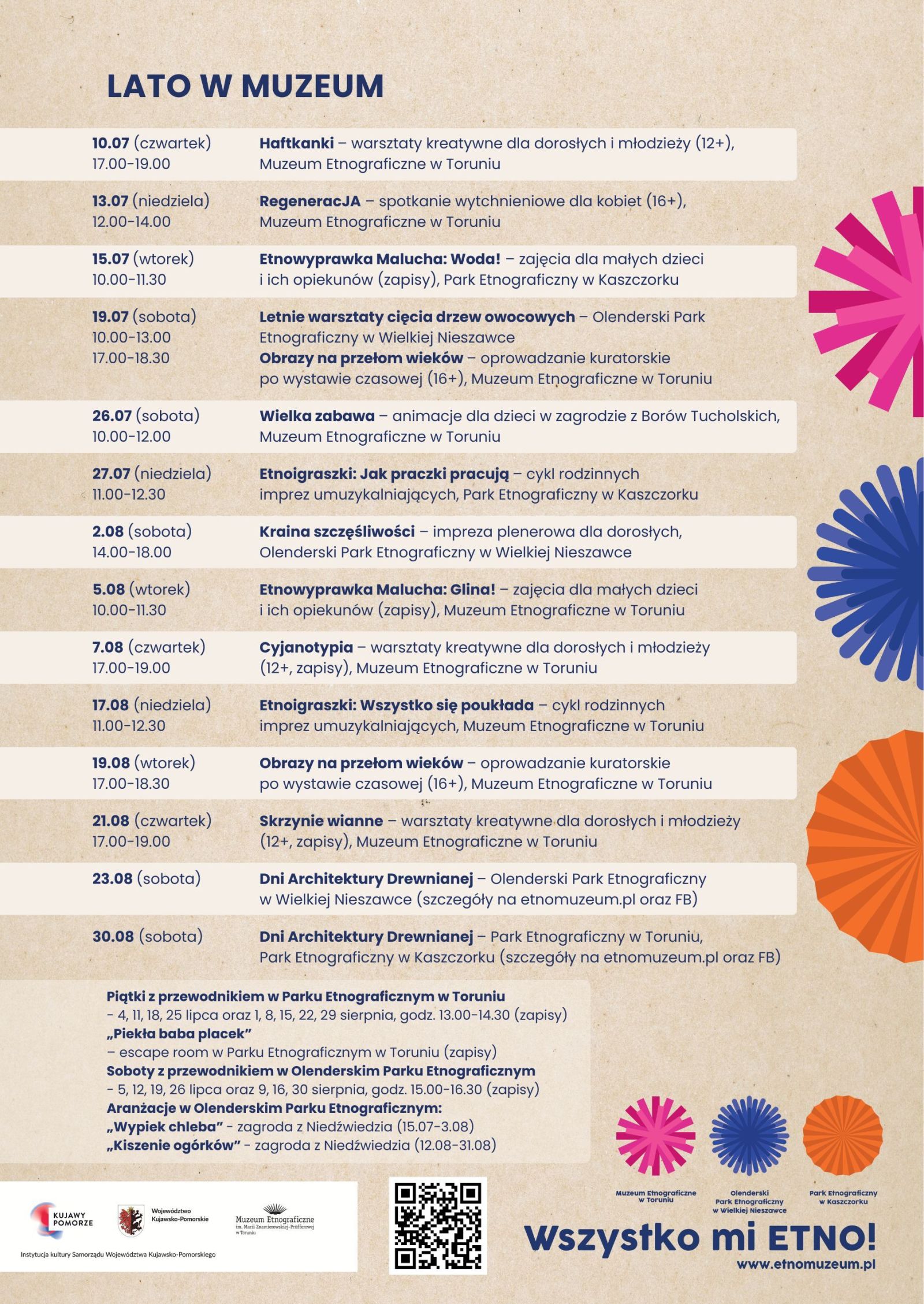 Warsztaty kreatywne dla dorosłych i młodzieży, spotkanie wytchnieniowe, zajęcia i animacje dla dzieci, imprezy plenerowe, rodzinne imprezy umuzykalniające, oprowadzania kuratorskie po wystawach - to tylko niektóre z wielu ciekawych propozycji przygotowanych przez Muzeum Etnograficzne im. Marii Znamierowskiej-Prüfferowej w Toruniu w ramach "Lata w muzeum".
